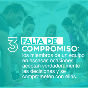3. Falta de compromiso: los miembros de un equipo en escasas ocasiones aceptan verdaderamente las decisiones y    se comprometen con ellas.